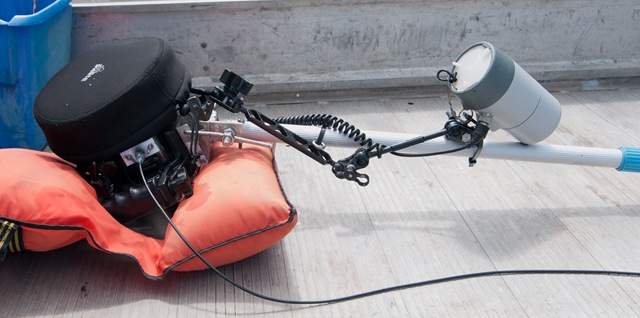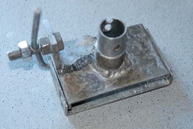 The pole and bracket are composed of an aluminium telescopic pool cleaner pole and a custom made aluminium bracket. The bracket is a hinged adjustable aluminium bracket that Justin had custom made by a local fabrication business. The bracket mounts onto the bottom of the Ikelite housing and bolts onto the end of the pole.