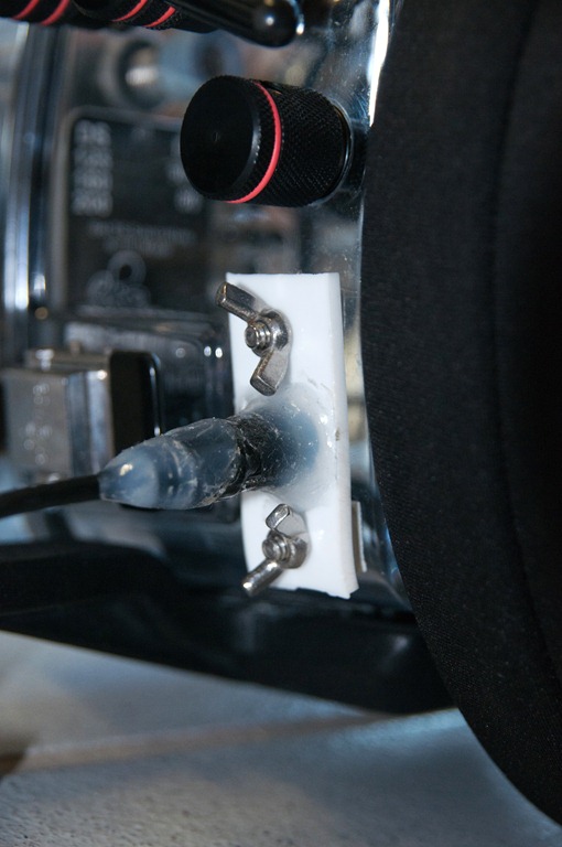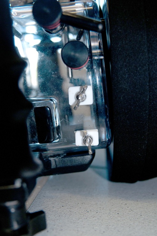 We initially tried Velcro to fix the mounting plate to the housing, but this proved unreliable. So we made a more solid fix using stainless steel bolts. These were set into two small Perspex tabs using Araldite. Then using the mounting plate as a guide we stuck these mounting bolts to the side of the camera housing with double sided tape. We then used the stainless steel wing nuts to mount the cable to the side of the camera housing. The mounting bolts aren’t in a position that causes any interference to normal operation so they stay on the housing when the remote is not in use.