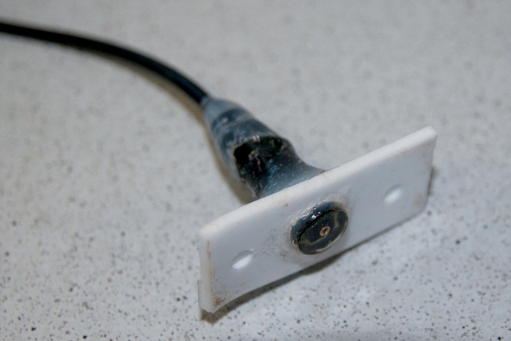 OK so we have the remote receiver, the cable and the remote control sorted. It all needs to be connected. Two mounting systems were created using the 3mm Perspex. At the camera end we fashioned a small mounting plate about 20mm wide and 60mm long. We drilled a hole in the centre to mount the end of the cable and two holes either side to accommodate the mounting bolts. The cable end is held in place with marine silicone.
